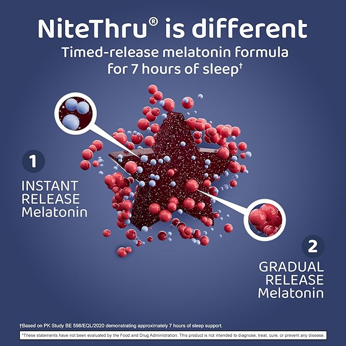- UP TO 7 HOURS OF SLEEP: The extended time release formula of NiteThru melatonin gummies is clinically proven to provide up to 7 hours of sleep*—with an initial release to help you fall asleep fast, and an additional timed release to help you stay asleep longer.