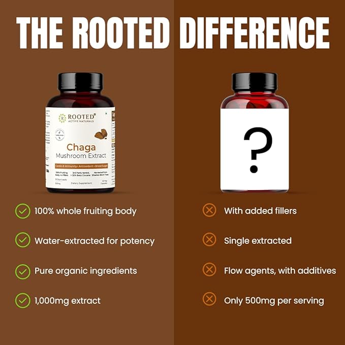 ROOTED Actives, Siberian Chaga Mushroom Extract, Certified Organic| 35% Beta Glucans - Lab Verified | Antioxidant & Vitality Support (60 Veg Caps)
