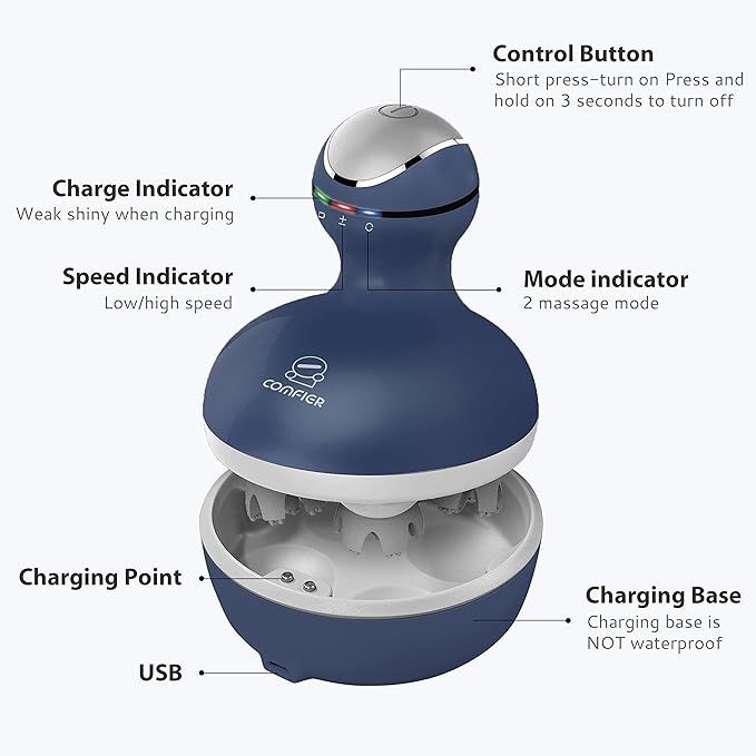 - Cordless & Rechargeable: The electric scalp massager is powered by rechargeable lithium-ion battery, so no need to plug in while in use. The massage tool comes with a charging base and a USB charging cable and it lasts for a couple of hours on one full charge. You can also use it as a dog massager or cat massager for your loved pets.