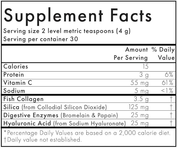 - SUPERCHARGED COLLAGEN PEPTIDES POWDER BLEND: Marine collagen works in synergy with vitamin C, hyaluronic acid, silica, and digestive enzymes to support glowing skin, strong nails, thick hair and a healthy body.