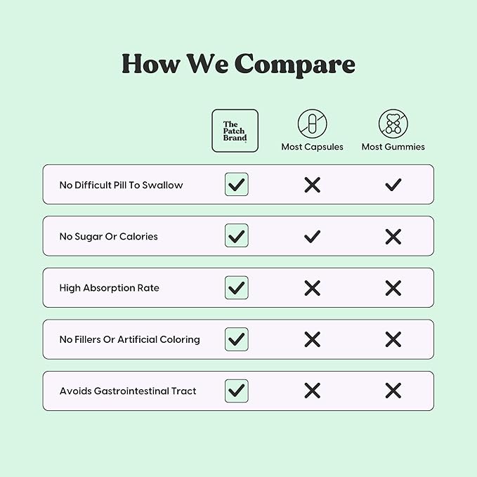 - SUPERIOR ABSORPTION: Vitamin capsules, tablets, and pills have poor absorption properties, allowing only 10% of the effects of the active ingredients. Our innovative patch allows for much higher absorption rates and a steady release of the active ingredientsâgiving you up to 24 hours of continuous benefit.