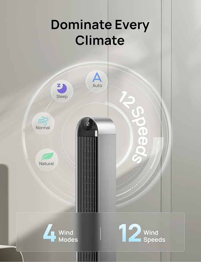 Dreo Tower Fan for Bedroom, 42 Inch 120° Oscillating Fan, 25dB Quiet DC Motor, 28ft/s Velocity Bladeless Standing Fan with 12 Speeds, 4 Modes, 12H Timer Cooling Fans for Home, Living Room, Pilot Max S