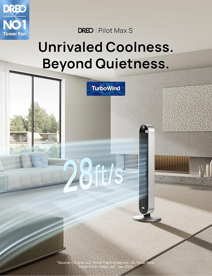- 𝙄𝙣𝙩𝙤 𝙩𝙝𝙚 𝙒𝙤𝙧𝙡𝙙 𝙤𝙛 𝙒𝙞𝙣𝙙: Optimized air outlets and ultra-wide 120-degree cooling enable Dreo Pilot Max tower fan for bedroom to circulate mind-blowing cool around the whole room at high speeds as fast as 27 ft/s