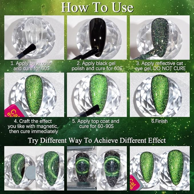 - Reflective Effect Cat Eye Gel Polish: Chameleon reflective cat eye gel polish includes trendy styles that is reflective glitter effect, 9D cat eye effect and galaxy effect. Attractive color changing effect will surprise you. Different effects depend on different lights and angles!