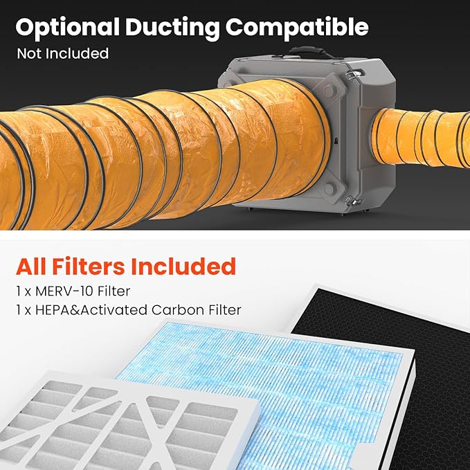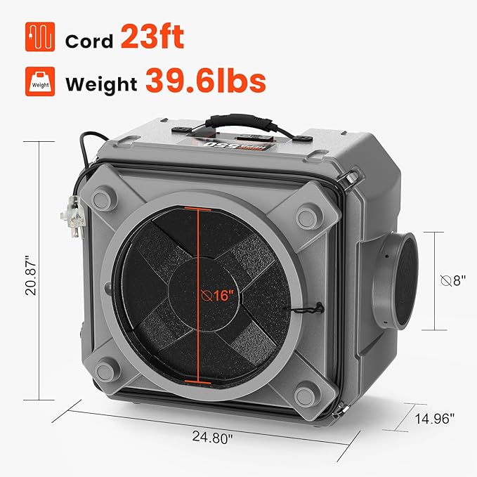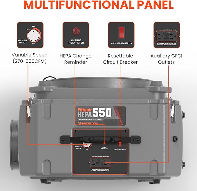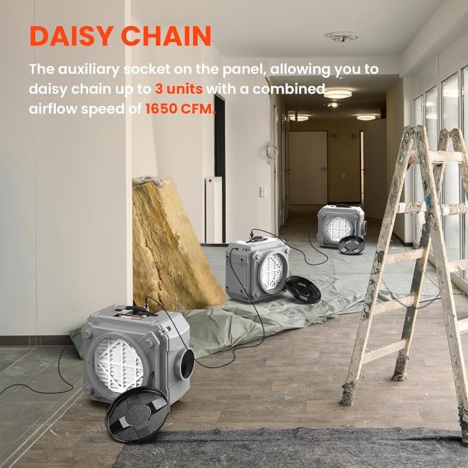- Easy to Use & Stack: The negative air machine is plug-and-play. It offers an adjustable airflow range of 270 to 550 CFM and comes with a built-in GFCI outlet, allowing for stacking up to 3 units together, generating a combined airflow of up to 1650 CFM, ensuring efficient air purification in larger areas. Additionally, Filteair 550 can be easily configured as a negative air machine, effectively removing contaminated air from enclosed spaces (duct sold separately).