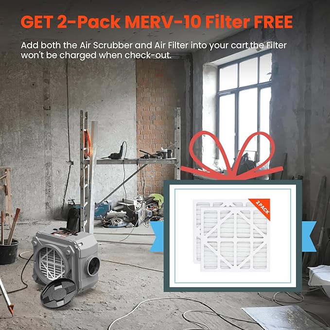 - Filteair 550 HEPA Air Scrubber: This air scrubber features a comprehensive 3-stage filtration system, including a high-performance MERV-10 pre-filter for capturing large particles of dust and debris. The HEPA filter, combined with the activated carbon filter, effectively captures 99.97% of particles larger than 0.3 microns, addressing allergens, granular,pet dander, and microscopic pollutants while efficiently eliminating unpleasant odors. [Buy Air Scrubber=⒈Air Scrubber + 2 Pack MERV-10 Filter,Add both to cart