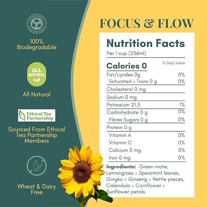 - Flavorful Citrus with Mint Infusion: Each yerba mate tea bag is a balanced infusion of Green Mate, Lemongrass, Spearmint Leaves, Gingko + Ginseng + Nettle pieces, Calendula + Cornflower, and Sunflower petals for a refreshing and energizing drink all day.