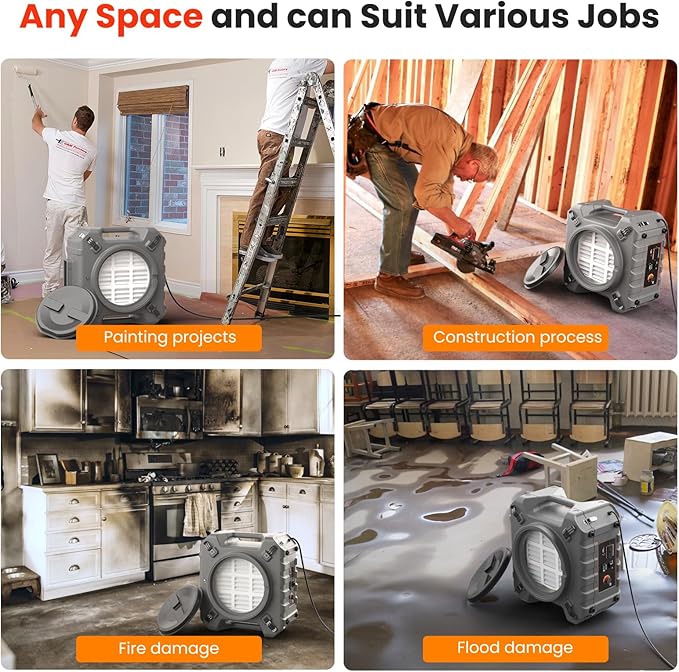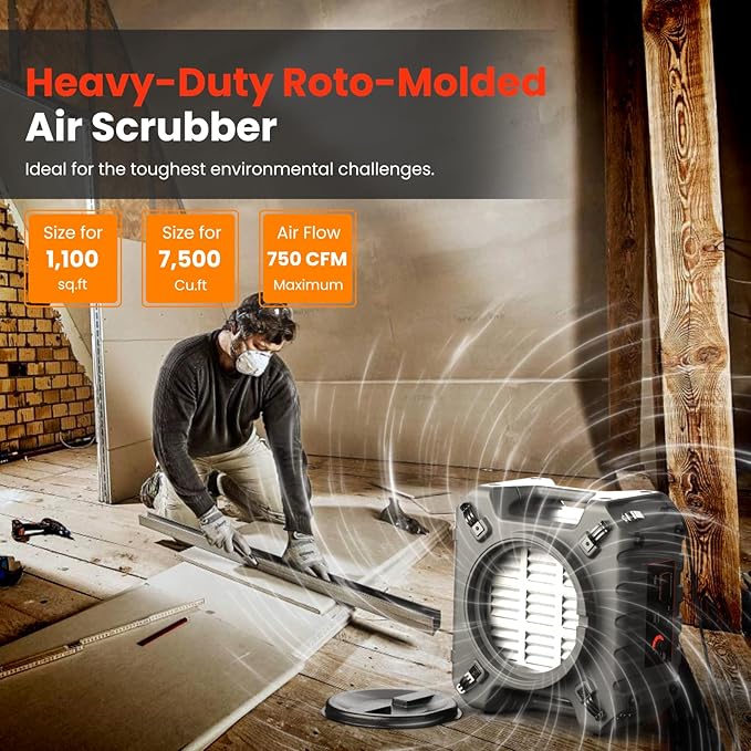 - Air Scrubber Commercial: The air scrubbers is small in size, up to 750CFM airflow, and Equipped with a portable ergonomic handle and stackable design, which is very suitable for home repair and construction sites, sewage repair, water and fire damage repair, and removal in supermarkets, hair salons and printing shops Unpleasant smell to improve indoor home air quality