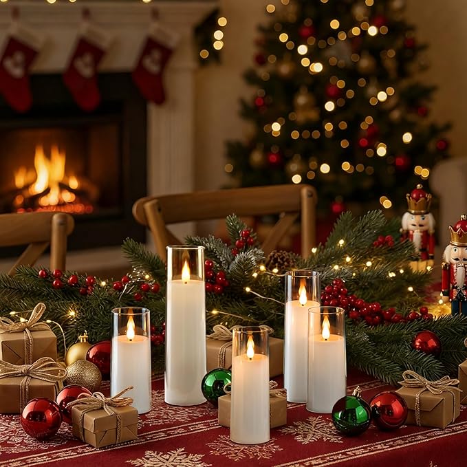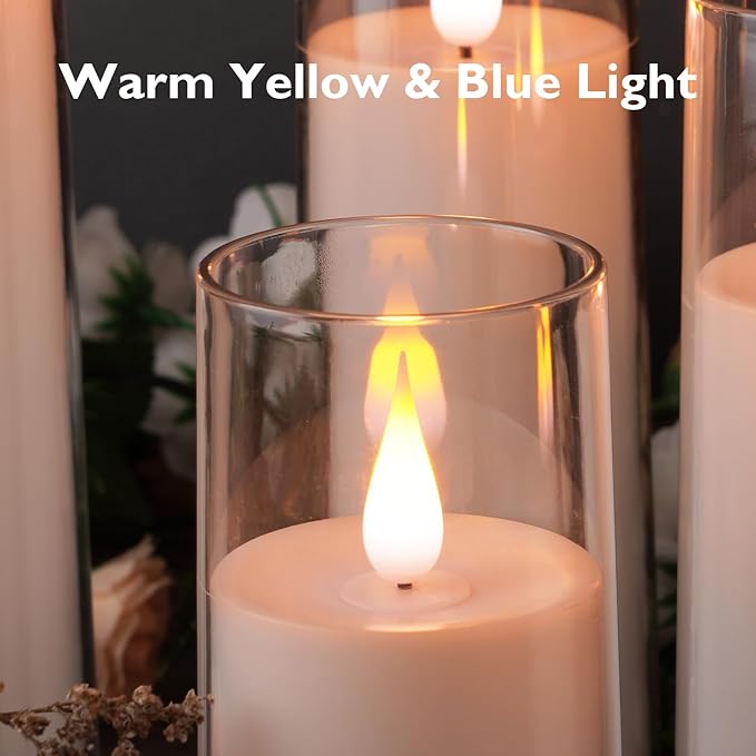 - Realistic Flameless Candles: Acrylic Candle Shell + 3D flame, flickering softly and giving these battery candles a warm yellow and blue glow, creating a cozy feeling, which is perfect for home, festival decorations, and gifts