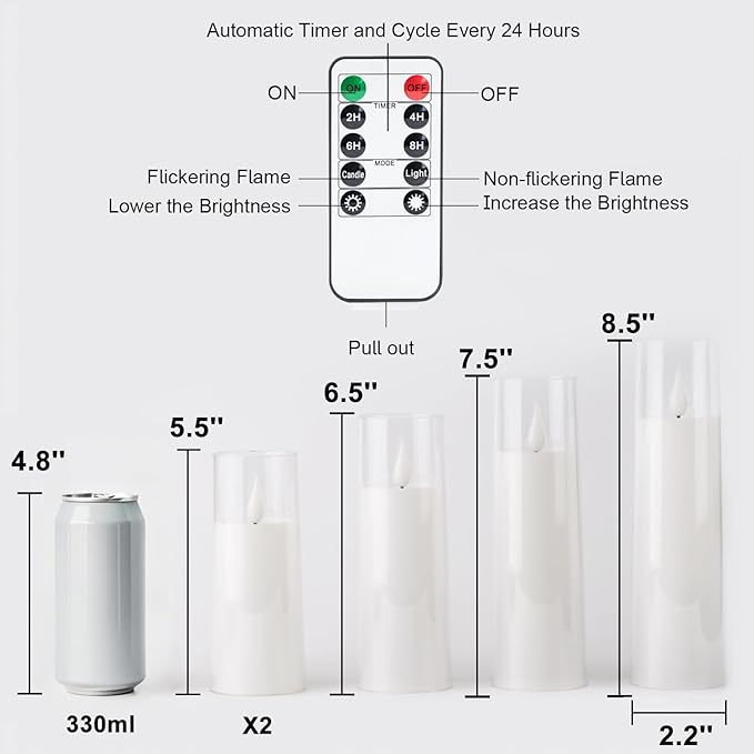 - Remote Control & Timer Function: The smart 10-key remote control makes the operation more convenient and flexible: adjust the brightness, the light modes and set the timer freely within 50 feet. Set a 2H/4H/6H/8H timers will save trouble to turn the electric candles on/off because they will come back on automatically at the same time every day
