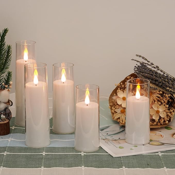 - Package Includes: This battery operated candle set includes five flameless pillar candles( D2.2”x H5”5”6”7”8”), a 10-key remote control, and a user manual. Each flameless candle is powered by 2 x AA batteries (not included) which can last for 500+ hours