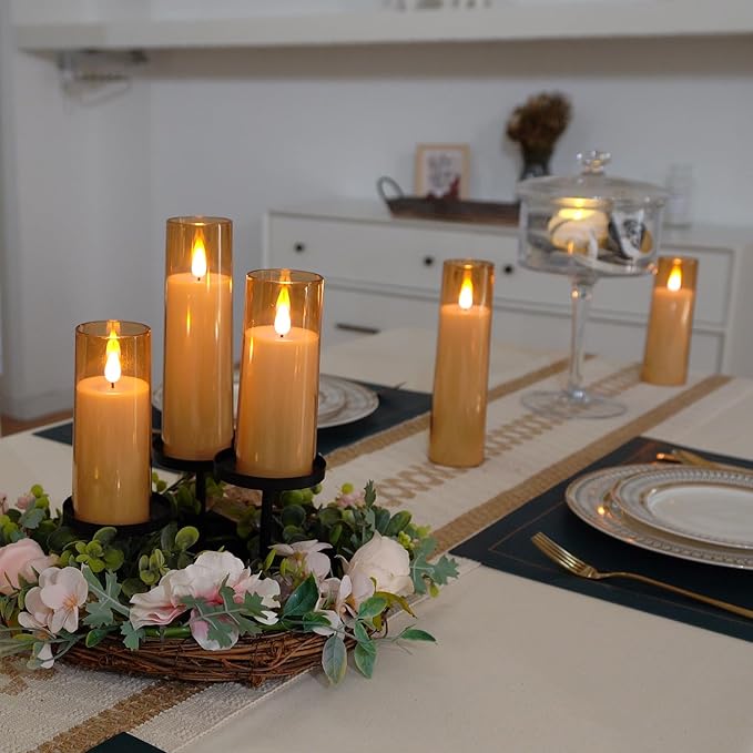 - Realistic Flameless Candles: Acrylic Candle Shell + 3D flame, flickering softly and giving these battery candles a warm yellow and blue glow, creating a cozy feeling, which is perfect for home, festival decorations,and gifts