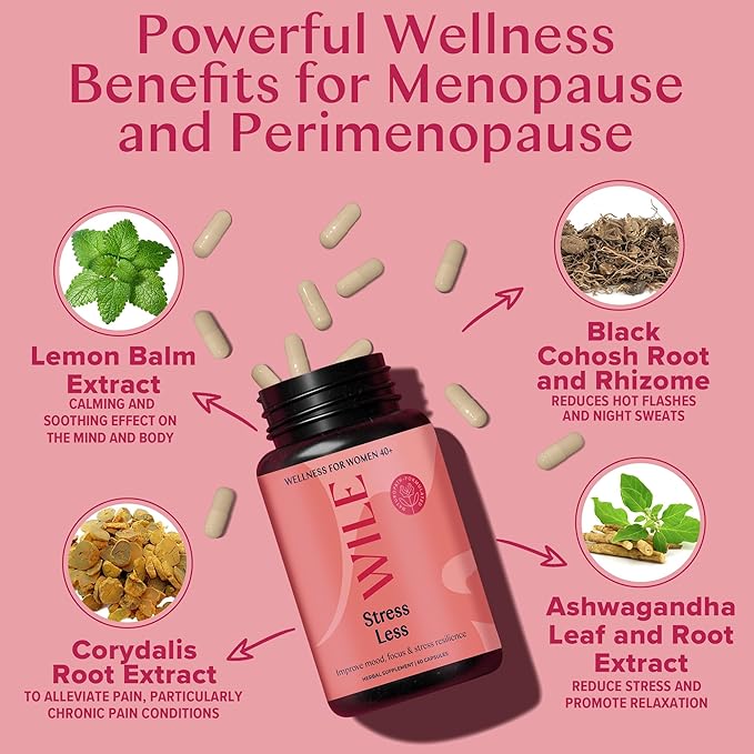 WILE Menopause & Perimenopause Supplements for Women with Ashwagandha - Stress Relief with Black Cohosh - Premenopausal Support for Improved Mood, Sleep, Hormone Balance - Vegan, 30 Servings