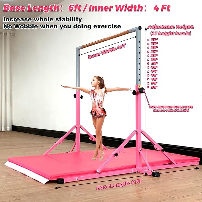 - 6 ft Fold Gymnastic Bar: This bar is 6 ft length with 4 ft width with 5ft adjustable height. 6 ft length gymnastic bar do not wobble when your kids do circle exercise or other professional exercise on it, suitable for home and gym club use