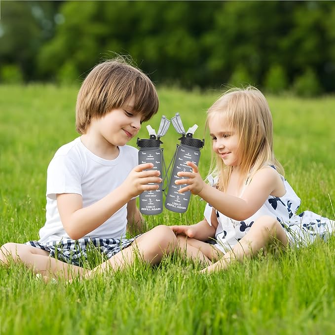 GOPPUS Kids Water Bottle with Straw Spout Lid 10pcs Stickers 17 oz Leak-proof BPA Free Motivational Time Marker Tritan Plastic Water Bottles for Girls Boys School Sports 2 Lids Grey