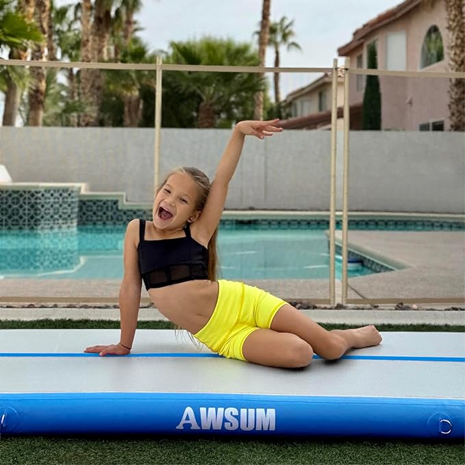 - Professional Tumbling Mat: AWSUM Air mats is made of 600D Filament Grade and high-quality PVC tarpaulin. All seams are made by handwork. Gymnastic mat Outer layer of mat is made of double-layer waterproof tarpaulin, better water-resistance. Tumble mat Inside is made of V-drop stitch technology, better flexibility