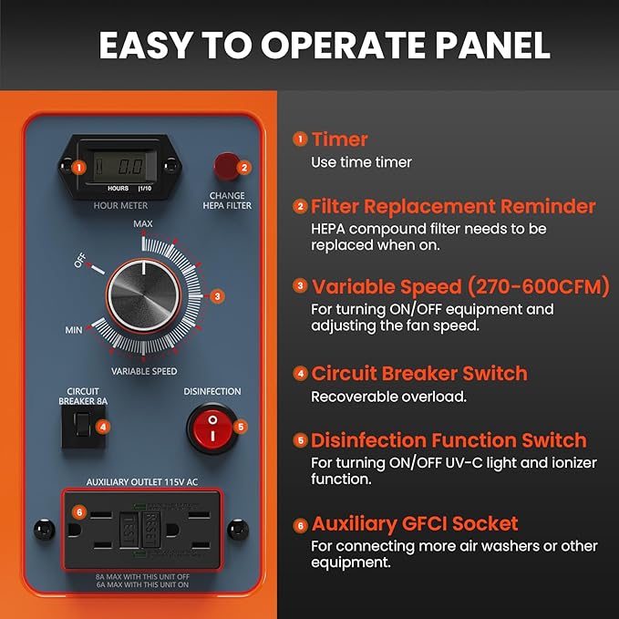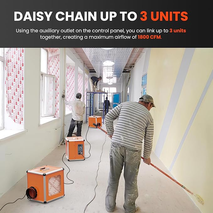 - Convenient for Your Use: Handle design and optional caster is convenient for you to move and use the unit. Circuit breaker switch protection ensures your safe use of this air scrubberw. The control panel is straightforward and easy to operate. It adopts a variable speed design, that meets 260 to 600 CFM variable airflow control. You can daisy chain up to 3 air scrubbers. The combined airflow speed is 1,800 CFM.