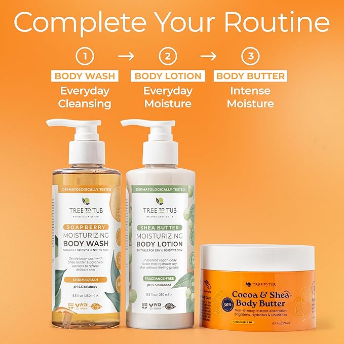 Tree to Tub Shea Body Butter for Dry, Extremely Dry, Sensitive Skin - Moisturizing Body Cream for Women & Men, Hydrating Body Lotion Moisturizer w/Vitamin C, Organic Cocoa, All Natural Citrus Scent