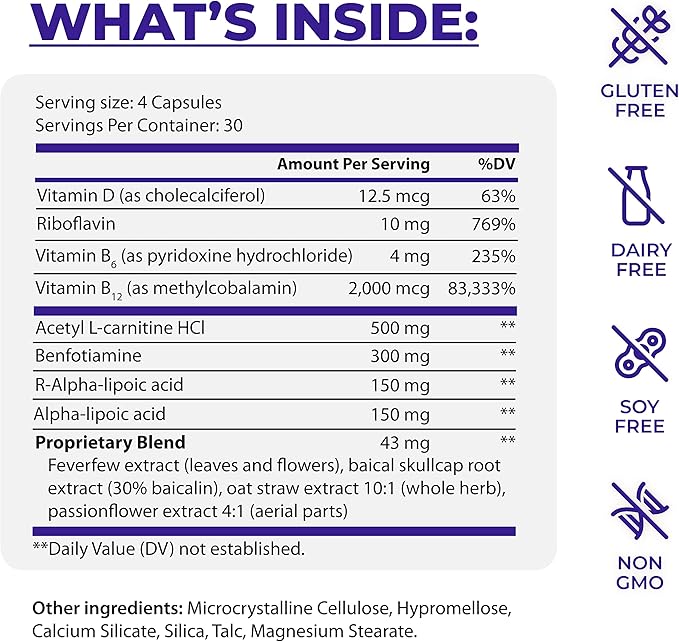 - ESSENTIAL B-VITAMIN COMPLEX: Our premium nerve health supplements feature crucial B vitamins including Vitamin B12, Vitamin B6, and Riboflavin that support healthy nerve function, energy metabolism, and overall neurological health.*