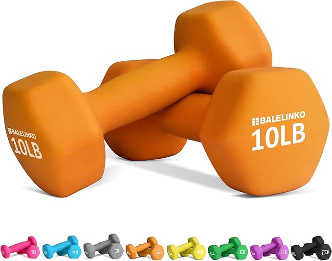 - ★STYLISH AND MODERN: Balelinko neoprene coated dumbbell weights are sold in pairs and available in 1, 2, 3, 4, 5, 6, 7, 8, 9, 10, 12, 15 pounds, which allow you vary the intensity of your workouts. Bright colors and large, clear numbers make these quick and easy to grab while in the zone.