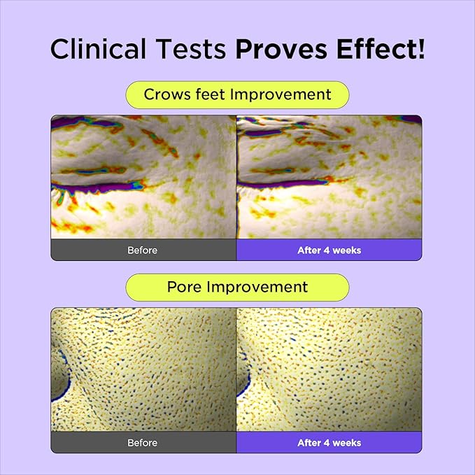 - ๐ NOTICEABLE RESULTS: โ Immediate effect on quantity, size, volume, and depth of the skin pore with one-time use โ Improvement on skin moisturizing, eye wrinkle, skin elasticity, face lift (cheek), skin density and skin texture (roughness) with 4 weeks use ๐FLUORESCENT YELLOW COLOR IS THE NATURAL COLOR OF RETINAL ๐