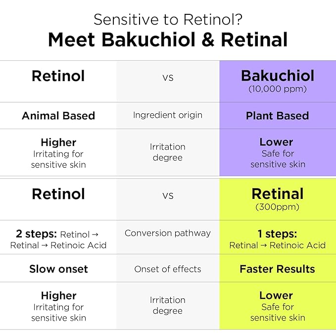 - ๐NEXT-GEN RETINOL: Formulated with two next-gen retinol alternatives, Bakuchiol (1%) and Retinal (0.03%). Retinal is the perfect alternative to the irritation of Retinol with a higher activity level. Bakuchiol is a plant-based retinol alternative with fewer side effects and is safer to be used for all skin types, making it easy for beginners. Formulated alongside with Hyaluronic Acid and ceramide, it works during your sleep so you can wake up to a visibly smoother, bouncier skin.