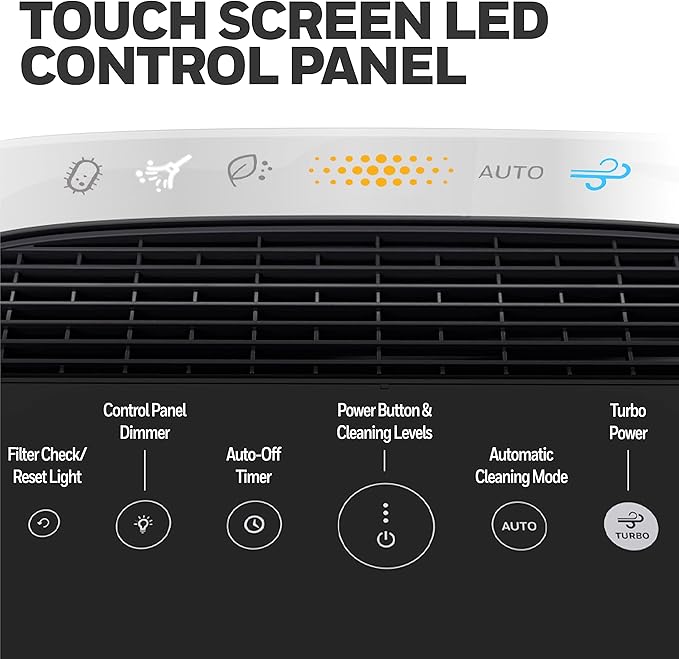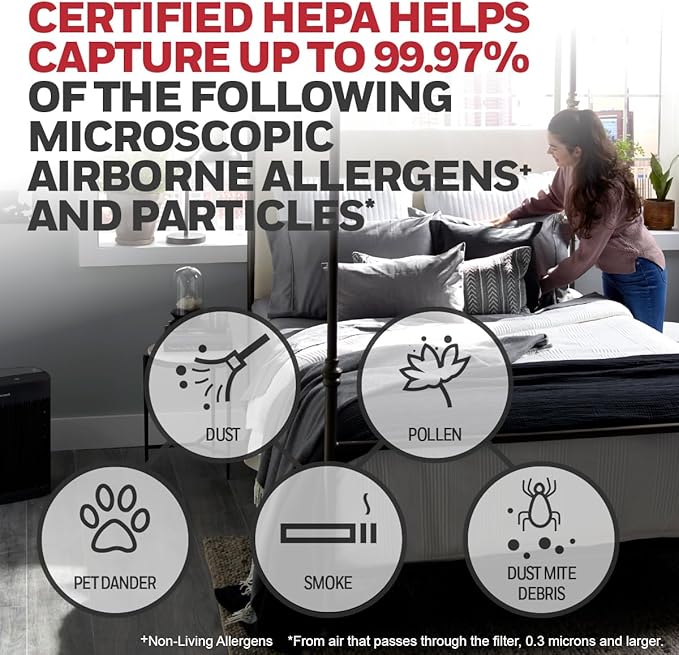 - HELPS REDUCE ALLERGENS –This HEPA air purifier has 4 cleaning levels including Turbo Clean. It helps capture the following microscopic airborne allergens and particles: dust, pollen, pet dander, dust mite debris and smoke.*