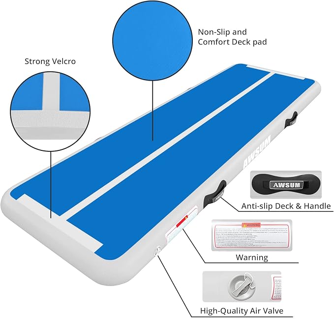 - Professional Tumbling Mat: AWSUM Air mats is made of 600D Filament Grade and high-quality PVC tarpaulin. All seams are made by handwork. Gymnastic mat Outer layer of mat is made of double-layer waterproof tarpaulin, better water-resistance. Tumble mat Inside is made of V-drop stitch technology, better flexibility