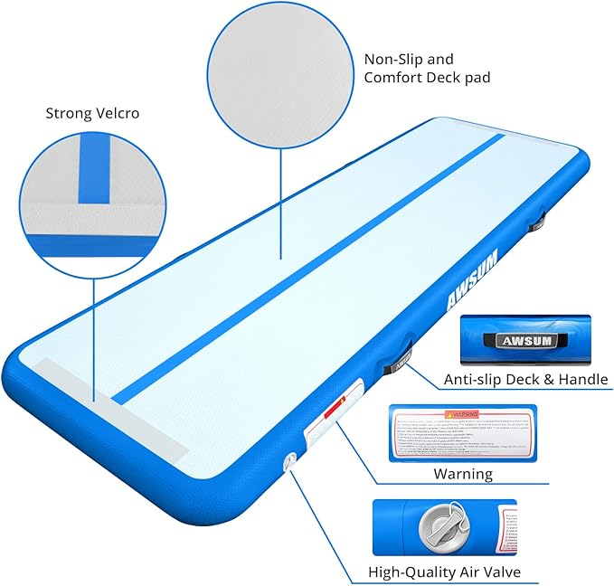 - Professional Tumbling Mat: AWSUM Air mats is made of 600D Filament Grade and high-quality PVC tarpaulin. All seams are made by handwork. Gymnastic mat Outer layer of mat is made of double-layer waterproof tarpaulin, better water-resistance. Tumble mat Inside is made of V-drop stitch technology, better flexibility