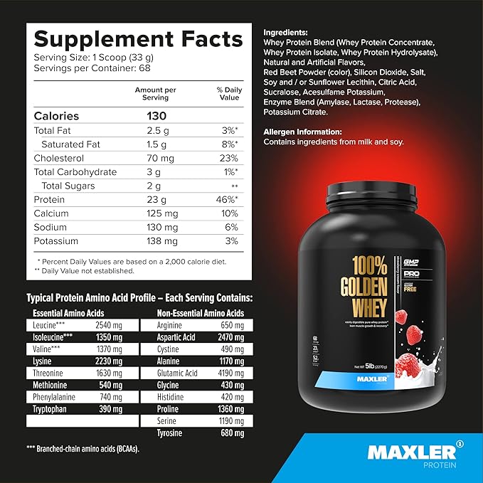 Maxler 100% Golden Whey Protein - 23g of Premium Whey Protein Powder per Serving - Pre, Post & Intra Workout - Fast-Absorbing Whey Hydrolysate, Isolate & Concentrate Blend - Strawberry Cream 5 lbs