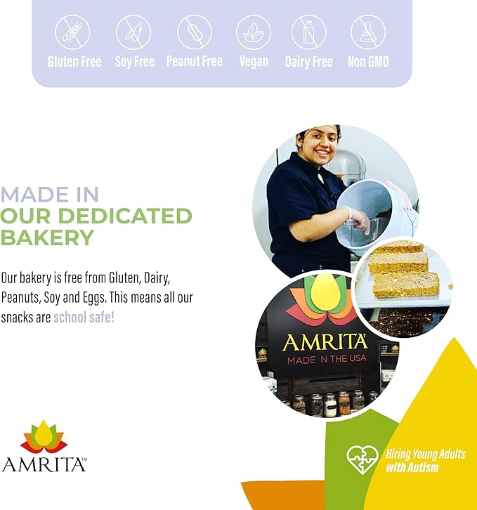 - Amrita Promise - We assure a friendly plant based, vegan snack manufactured on dedicated equipment free of top allergens and operated by our specially trained staff.