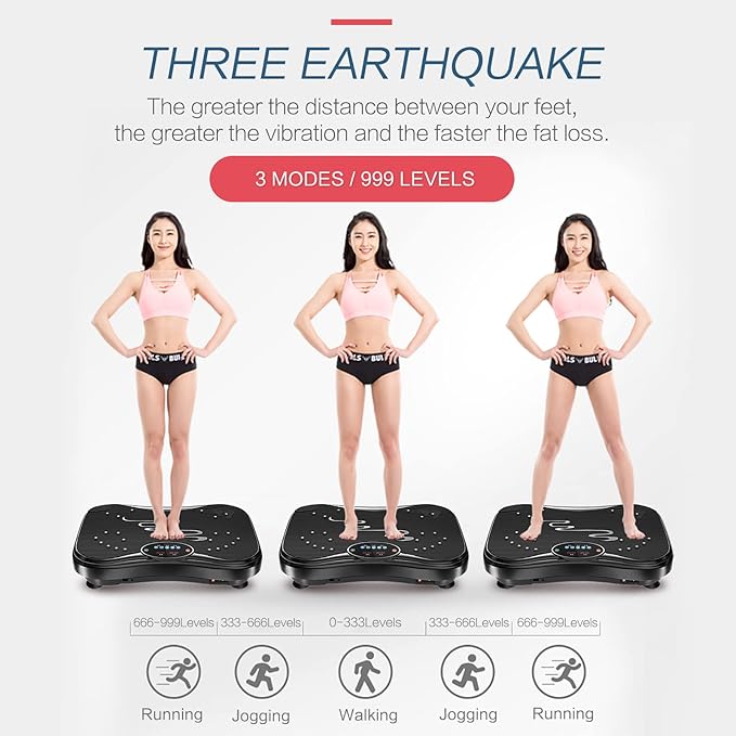 - 【1 TO 999 SPEED SETTINGS】Remote easily controls the speed at the click of a button. LCD digital display has program selection, which can imitate walking, jogging, running, yoga, etc. This professional body vibration plate massager comes with 3 preset modes, allow you to try different vibration exercises or combine the vibration exercise with normal workout, sit-up, push-up, yoga, etc. Perfect for sports training, weight loss, burning fat.