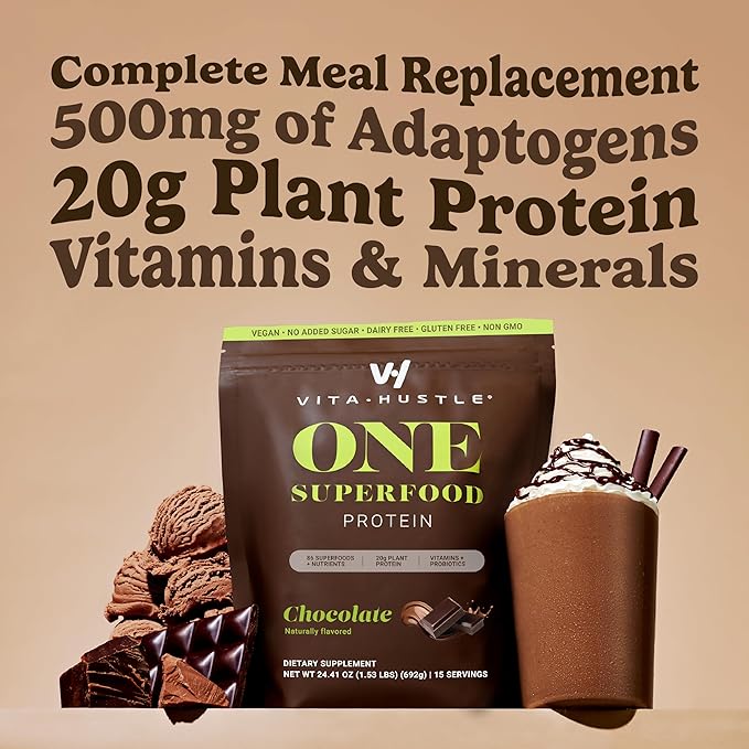 VitaHustle ONE Meal Replacement Shake - Plant Based Protein Powder by Kevin Hart - Vegan, Meal Replacement Powder with Superfoods, Vitamins, Adaptogens & Probiotics - Chocolate Flavor, 15 Servings