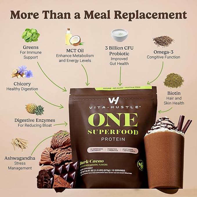 - SATISFYING & SUPER DELICIOUS – Filling without the fillers, silky-smooth and oh-so-satisfying, ONE by VitaHustle is never chalky or clumpy. Enjoy it blended over ice with water or plant-based milk, or add it to your favorite smoothie! Use it as a meal replacement, snack or after workout recovery shake.