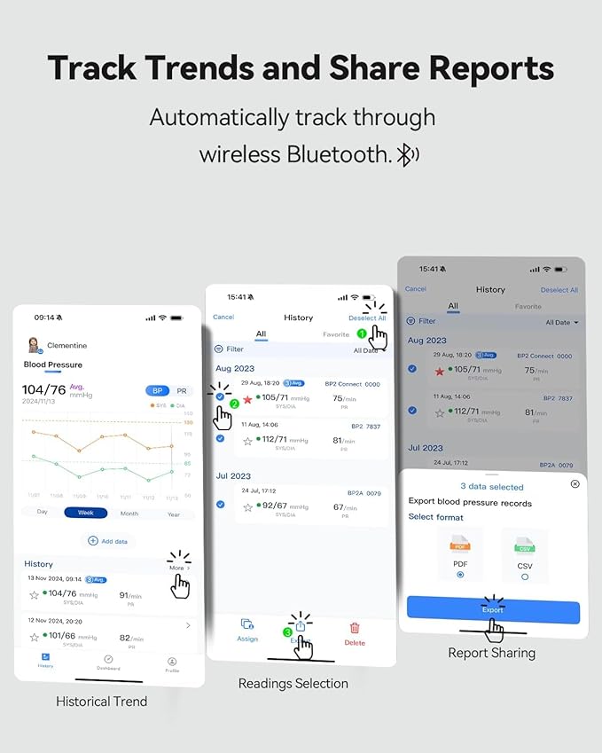- 【BUILT-IN BLUETOOTH】- Multi-user record management on ViHealth app. Free to access, review and share records & reports (PDF & CSV) on your iOS or Android