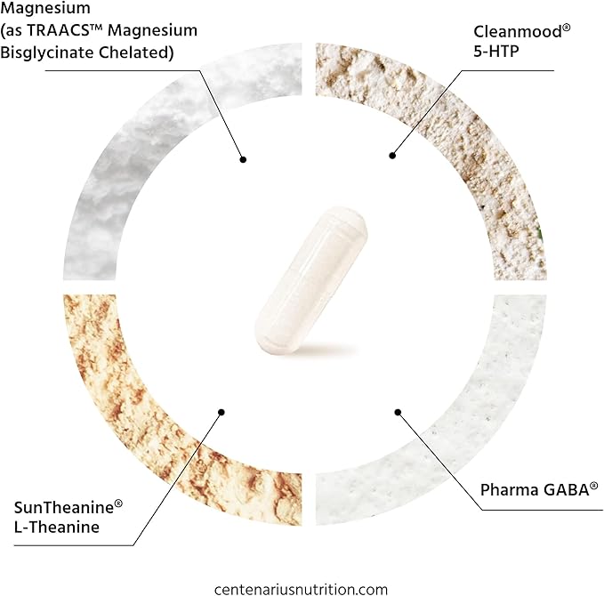 - ๐ค Optimize Your Sleep Schedule - Our Sleep & Mood supplement has a proprietary combination of ingredients to help you achieve restful sleep, that will have you feeling refreshed when you first wake up in the morning. Centenarius Sleep + Mood contains several calming ingredients such as Chelated Magnesium Bisglycinate, Suntheanine L-Theanine, 5-HTP, and PharmaGABA.
