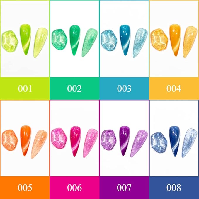 - Summer Collection: You will get 8 different bright neon colors Cat Eye Gel Nail Polish and 1 magnetic stick, 7ML(0.24FL OZ) each bottle