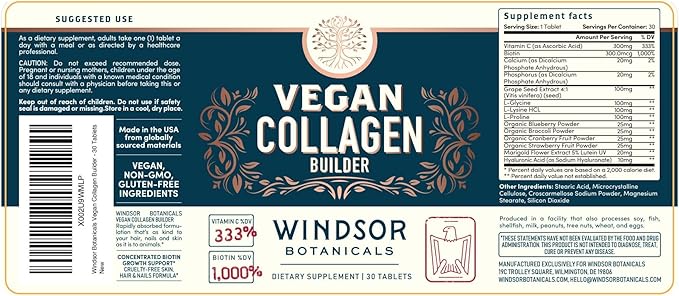 Vegan Collagen for Women and Men - Organic Superfood, Amino Acids Glycine, Lysine, Proline for Healthy Skin, Hair, Nails - Plant-Based Collagen Booster Supplements - 60 Gluten-Free Vegetarian Pills