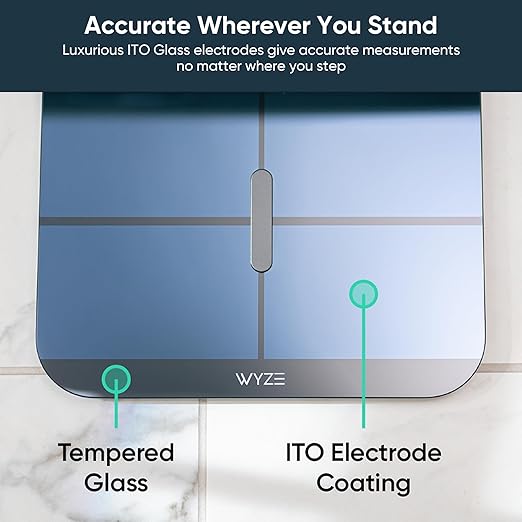 - ADVANCED DESIGN - An ITO coating of the tempered glass used on Wyze Scale X gives highly accurate body composition measurements wherever you stand. You can see your weight and body fat measurement over the scale's luxurious digital LED screen.