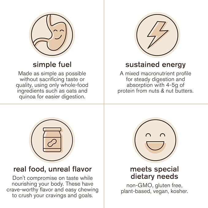 - PEANUT BUTTER + CHOCOLATE: Chocolate and creamy nut butter with a touch of sea salt – has there ever been a more perfect combination? These whole food bars are healthy, clean, and provide complex carbs compared to the leading protein bars or granola bars.