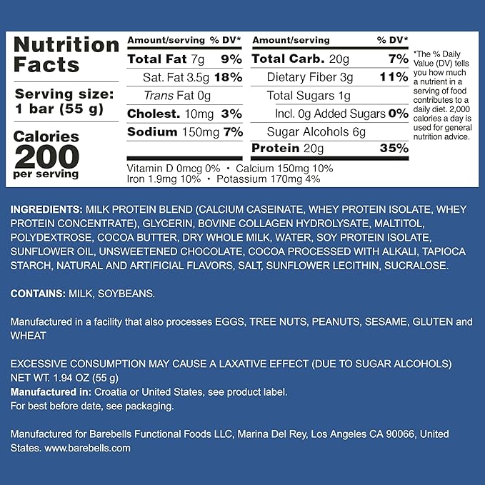- BAREBELLS CHOCOLATE DOUGH PROTEIN BAR - 12 individual yummy Barebells protein bars (Pack of 2) ! Tired of eating bars that taste like cardboard? Our delicious Chocolate Dough bars are filled with mouthwatering chocolate dough, covered in creamy milk chocolate, and coated in chocolate crisps.
