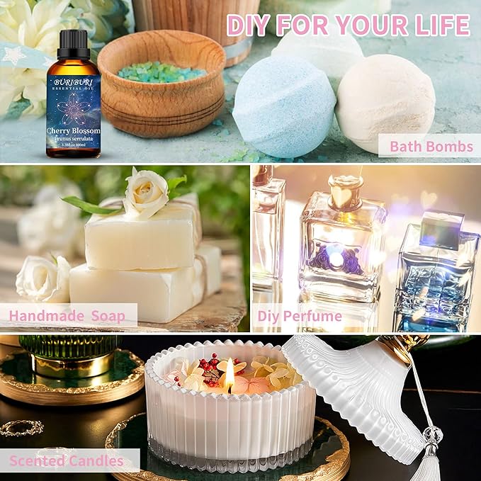 - Packing Includes: 100ml Cherry Blossom Essential Oil x1. With no adulterants or dilution, 100% pure quality. BURIBURI Cherry Blossom oil is bottled in a durable amber glass bottle.