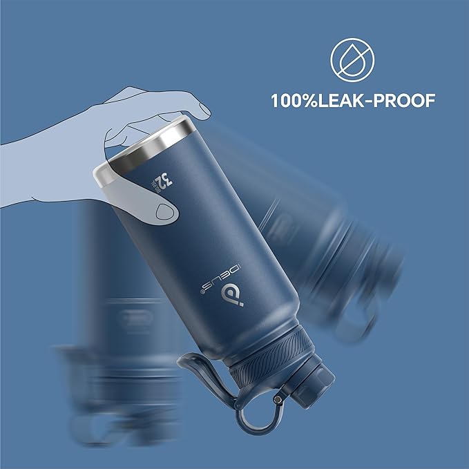 IDEUS Insulated Stainless Steel Water Bottle with 2 Leak-Proof Lids, Thermal Water Flask for Hiking Biking, 32oz, Navy Blue