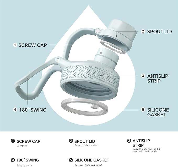 IDEUS Insulated Stainless Steel Water Bottle with 2 Leak-Proof Lids, Thermal Water Flask for Hiking Biking, 40oz, Light Blue