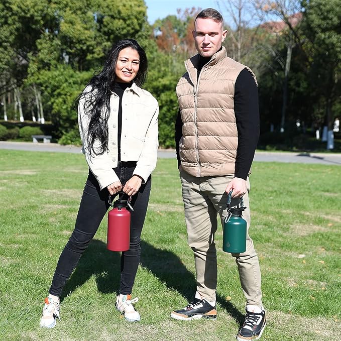 - BPA FREE & NO-SWEAT DESIGN: This large water bottle insulated is 100% BPA. No sweat design makes it comfortable and safe to hold. With the durable powder coating, it looks more colorful and stylish. It is perfect for traveling, hiking, cycling, camping, fishing, gym and other activities