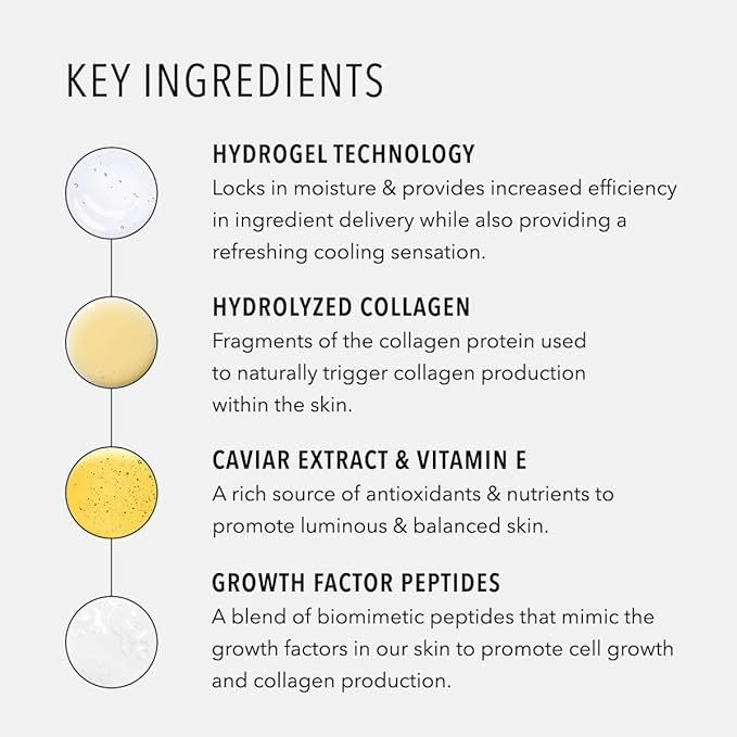 - Antioxidant Infused: Peptides, Niacinamide, Caviar Extract, Hydrolyzed Collagen and Vitamin E provide a rich source of antioxidants, promoting a better complexion after just one use. Perfect for a quick fix with cumulative anti-aging benefits over time
