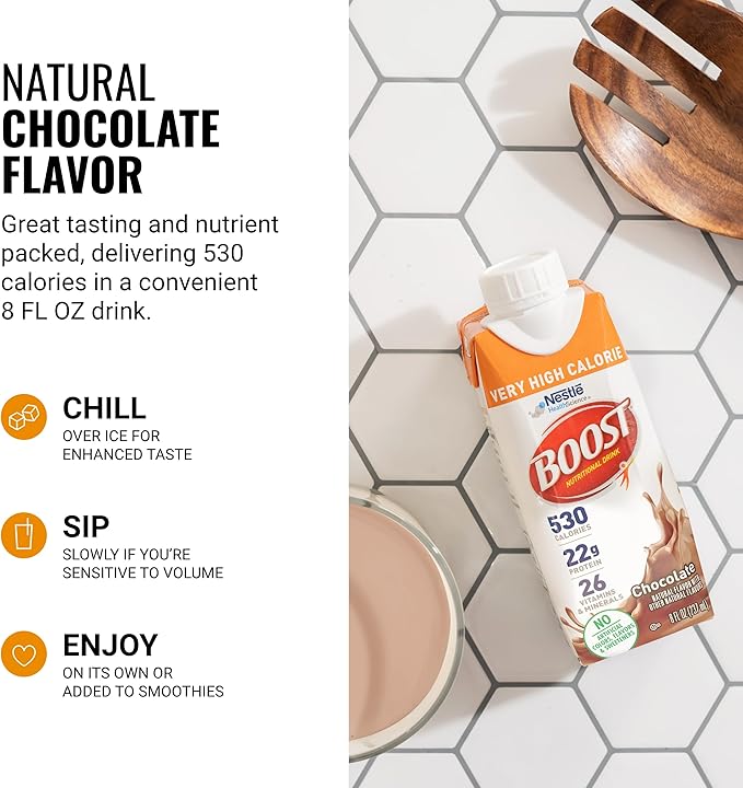 BOOST Very High Calorie Nutritional Drink – Helps Weight Gain & Maintenance - 530 Calories - 26 Vitamins & Minerals - 22 g Protein - Calorie-Dense Nutritional Drink - Chocolate - 8 fl oz (Pack of 24)