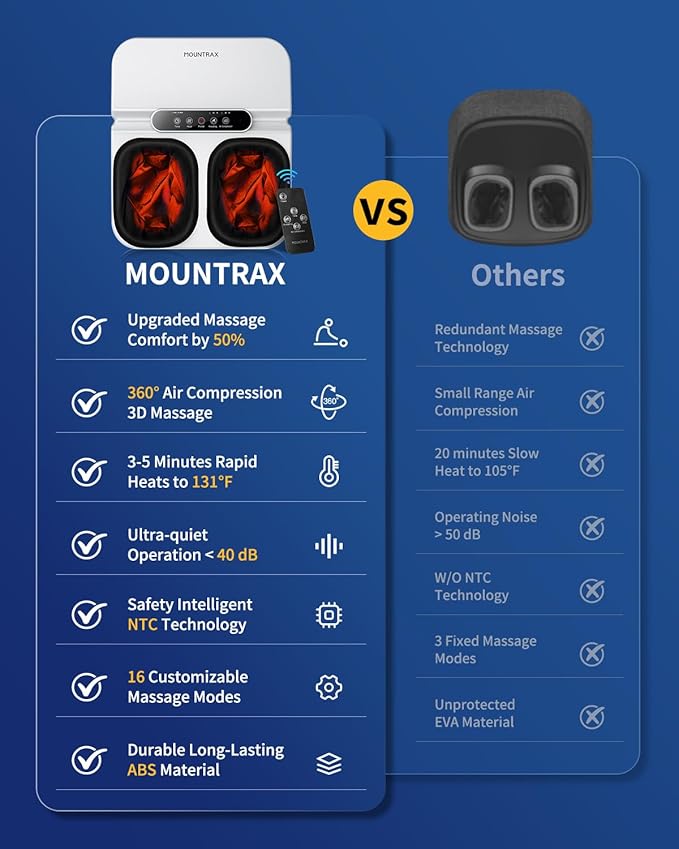 - MOUNTRAX Foot Massager with Heat - Features dual independent rolling heads and 6 groups of ergonomic nodes that precisely target reflex areas (arch, heel, and forefoot), delivering deep tissue pain relief for plantar fasciitis and neuropathy. 15-30 min/day to improve circulation and enhance foot health
