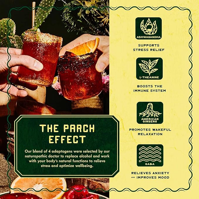 - The Parch Effect: Each non alcoholic Spiced Piñarita mocktail contains up to 185mg of our custom combination of Ashwagandha, L-Theanine, and American Ginseng. When consumed regularly, Adaptogens help your body better manage stress by protecting against adrenal fatigue. We call this ‘The Parch Effect’.