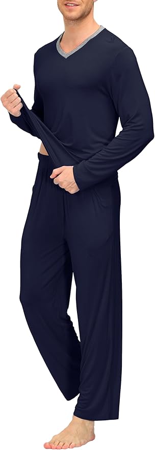 - 【Long Sleeved Top】The top of this men's sleep sets features long sleeve, V neck front fashion design, back neck tagless design, will not rub your skin, so that you are always comfortable. Simple casual, Perfect for house or daily wear on cooling day.